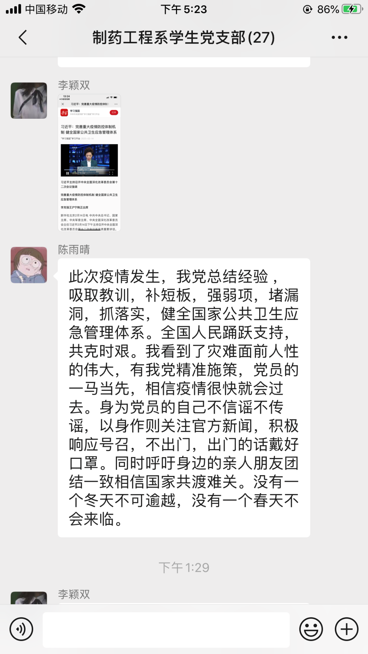 习近平总书记指出,这次抗击新冠肺炎疫情,是对国家治理体系和治理能力的一次大考。要研究和加强疫情防控举措,健全国家公共卫生应急管理体系,提高应对突发重大公共卫生事件的能力水平。制药工程系学生党支部全体党员通过线上学习了全文并展开交流研讨。