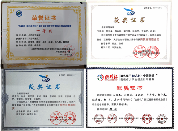 近五年积极组织制药工程专业学生参加国家级和省部级各类大赛,在第八届和第十届全国大学生制药工程设计竞赛中获一等奖。在全国“互联网+”大学生创新创业大赛、安徽省“互联网+”大学生创新创业大赛、安徽省“挑战杯”大学生课外学术科技作品竞赛、安徽省大学生创业大赛等系列赛事中获得一、二、三等奖共计20余项。学生主持国家级和省级大学生创新创业项目共计40项,发表论文25篇,授权专利5项。近五年专业学生考研录取率35%以上,四级通过率81%以上,用人单位满意度90%以上,创业率3%以上,在校生创业入驻校级创业孵化基地2项。学生利用假期开展行知学堂等社会实践活动,获合肥市经开区授予优秀志愿服务项目,学生团队获安徽省大中专学生志愿者文化科技卫生“三下乡”社会实践三等奖。