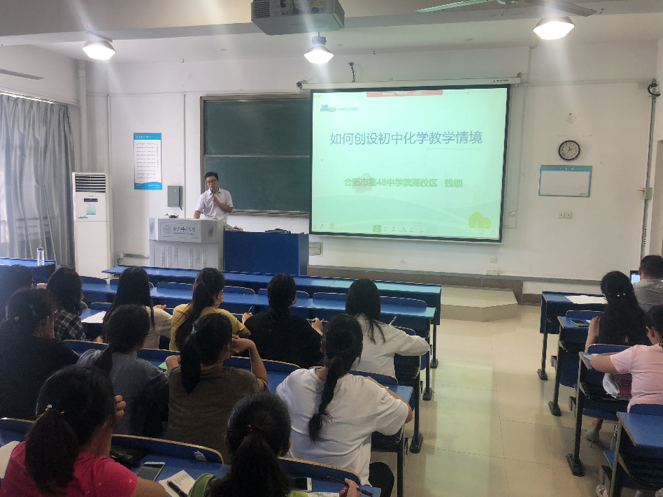 本网讯 9月11日下午,合肥四十八中滨湖校区化学教研组长钱锁老师在逸夫楼201教室作了题为《如何创设初中化学教学情境》的学术报告。报告由化学教育系主任凌波主持,化学教育系部分教师及2017级、2018级全体学生一同聆听了讲座。