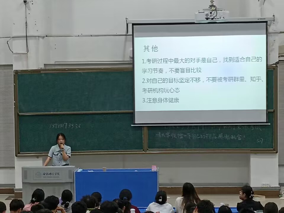 张晖结合2018级学生考研情况,从考研选择、内驱动力、取舍得失、学习技巧等四个方面给同学们提出指导性意见,勉励在场所有学生,以四位优秀学姐为榜样,努力向上,自立自强。