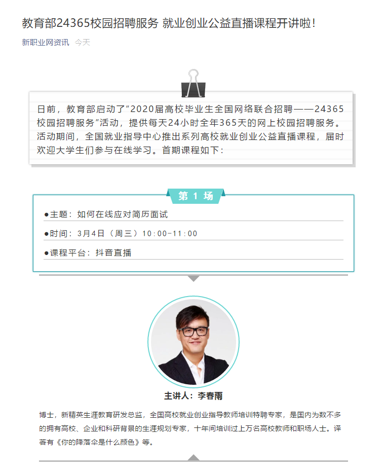 “应对疫情 就业服务”系列之十:教育部24365校园招聘服务 就业创业公益直播课程开讲啦!