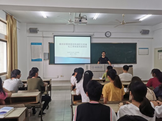饶日川老师首先介绍了碳纳米管的结构、性能以及应用,并着重介绍了碳管表面结构在催化领域的应用以及仍然需要解决的问题。然后饶日川老师介绍了自己近年来在碳纳米管表面结构调控方面取得的研究成果。在互动提问环节,饶日川老师与学生进行了深入交流和讨论,使学生受益匪浅。最后饶日川老师鼓励学生学好专业知识,积极关注学科发展前沿,及时掌握学科发展动态,培养科研创新思维,为今后的工作、学习和深造打下坚实的基础。(化学与化学工程学院)。