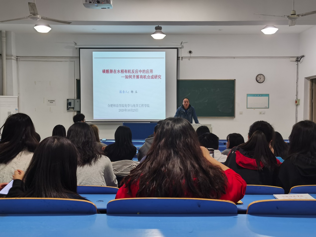 本网讯 2020年10月25日,药物制剂教研室杨玉博士为2020级制药工程、药物制剂全体学生做专题为“磺酰肼在水相有机反应中的应用”的学术报告,报告由药物制剂陈虎副教授主持。