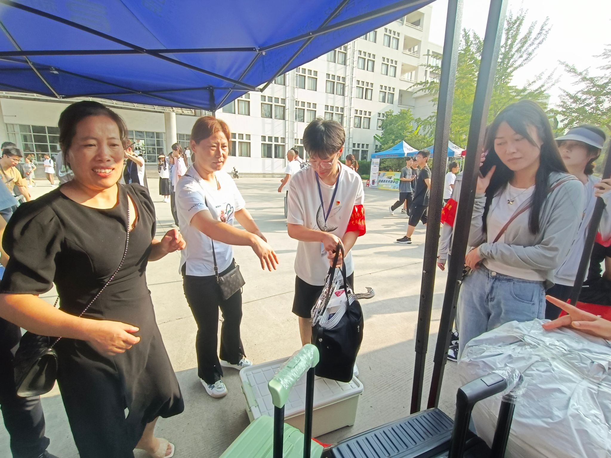 在宿舍区,学生党员与志愿者指引新生进行宿舍登记。与此同时,宿舍楼中的学生党员们积极帮助新生搬运行李,在搬运途中为新生答疑解惑,服务在迎新的第一线。