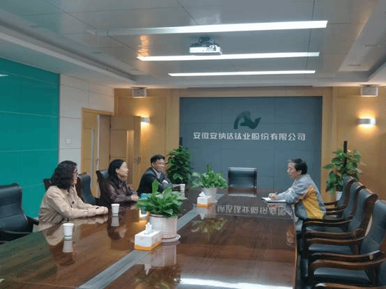 徐祝青代表学院向安徽安纳达钛业股份有限公司介绍学院师资力量、专业设置和在校学生情况。蒋总介绍了公司现有总资产、职工总数,主产品钛白粉生产能力及钛白粉系列产品品种。卫艳新教授与蒋总就钛白粉生产制造和新能源材料的发展研究做了详细交流。