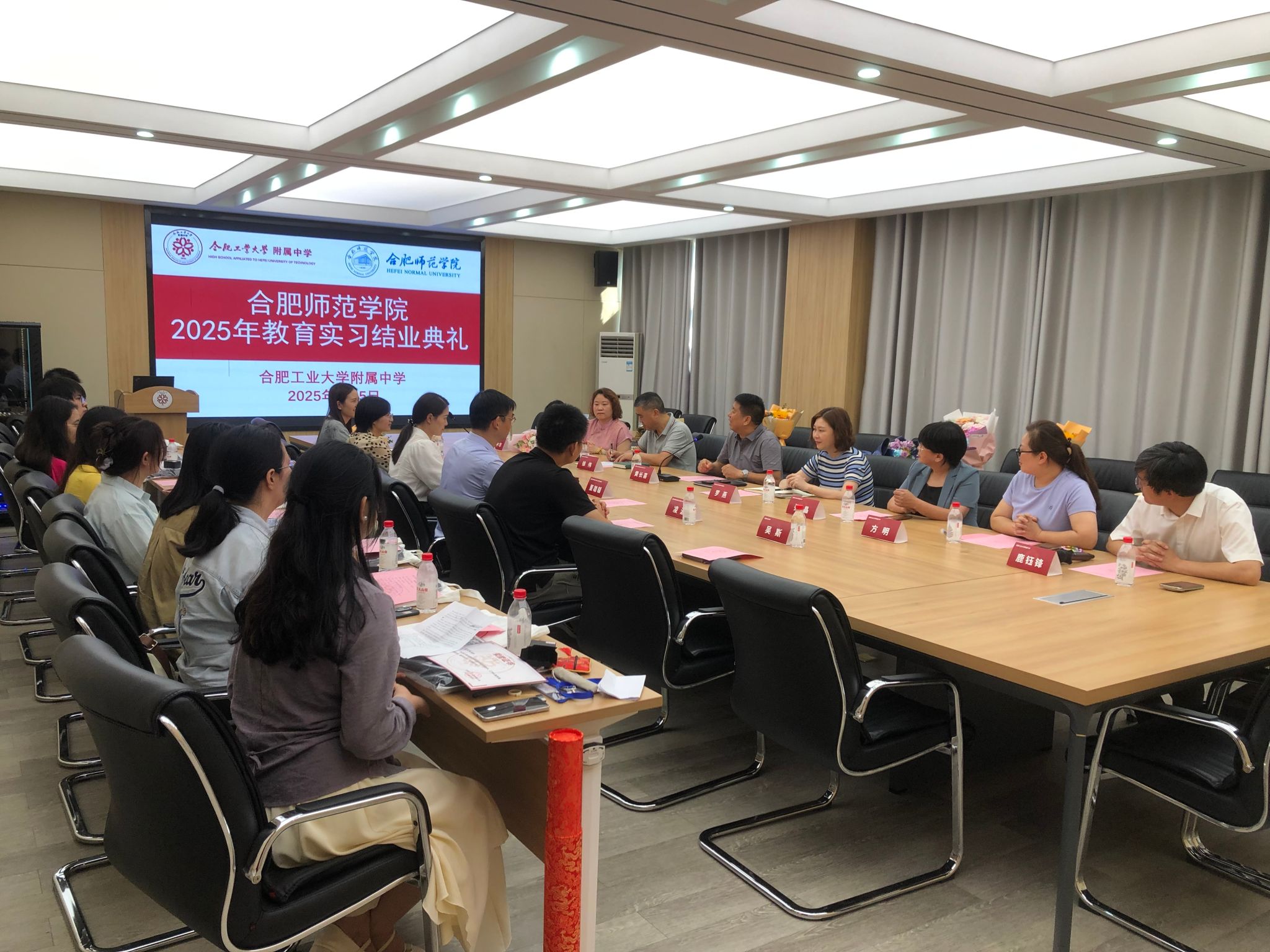 罗燕代表合工大附中致辞,高度肯定了实习成效,并寄语实习生坚守教育初心。沈瑞芮宣读了聘任实习指导教师文件,并为指导教师发放聘书。工大附中化学学科组组长方明老师宣读了优秀实习生名单。谢世丽汇报了九位同学本学期的实习情况,同时也对各位指导老师的关心和指导表示感谢。指导教师代表赵园青从教学相长视角,讲述了指导与被指导的双向奔赴。董雄辎对化学实习生的表现给予肯定,同时也对附中为我院教育实习提供的良好平台表示感谢,希望双方在合作共建中形成育人合力,持续为基础教育事业输送新生力量。黄长喜聚焦校际合作,回顾过往合作成果,展望未来在课程研发、师资互培、实践基地共建等方面的新路径,期待双方持续携手,书写更具深度与广度的教育合作新篇章。