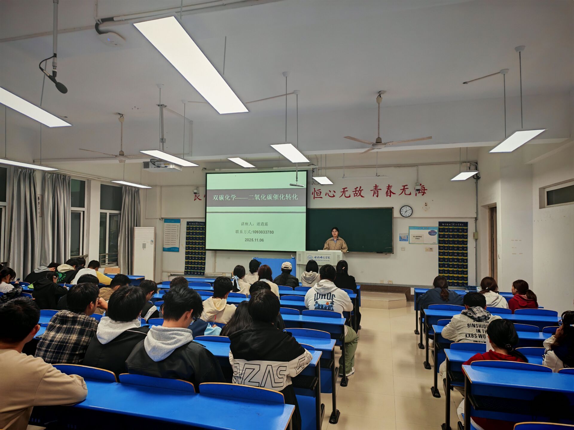 本网讯 11月6日下午,awc77万象城官网教师道逍遥博士在锦绣校区逸夫楼A306举行了一场题为“双碳化学——二氧化碳催化转化”的学术报告。化学等相关专业学生聆听了报告。
