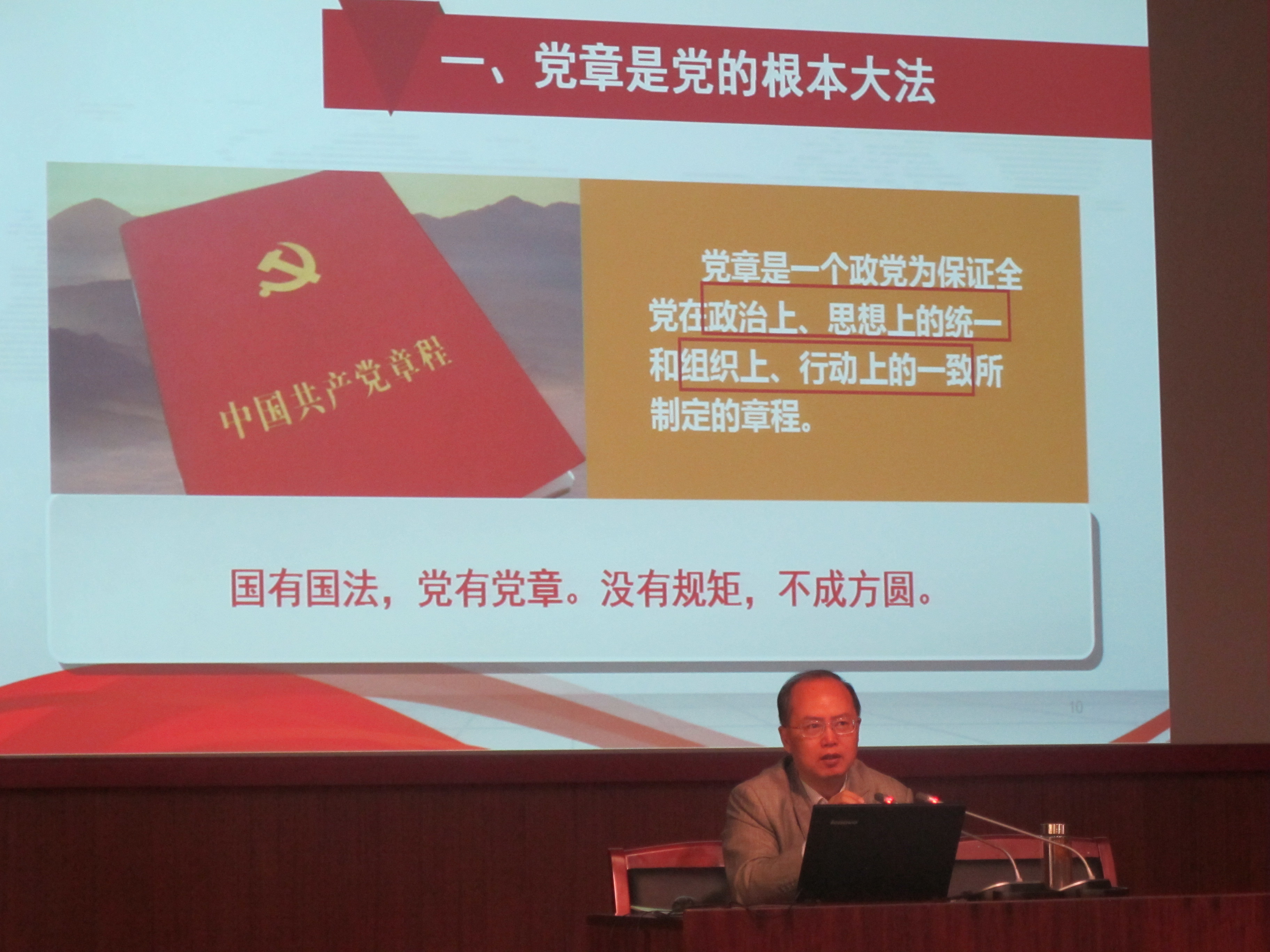 其次,王教授从“闯红灯与反腐败”的关系入手,介绍了普通百姓、政府官员和共产党员所面临的问题,引出“党章是党员的言行规范”,他强调了党章中规定的党员八项义务,同时介绍了党章中规定的六项党员干部的基本条件,并简要介绍了关于这部分内容的历史沿革。