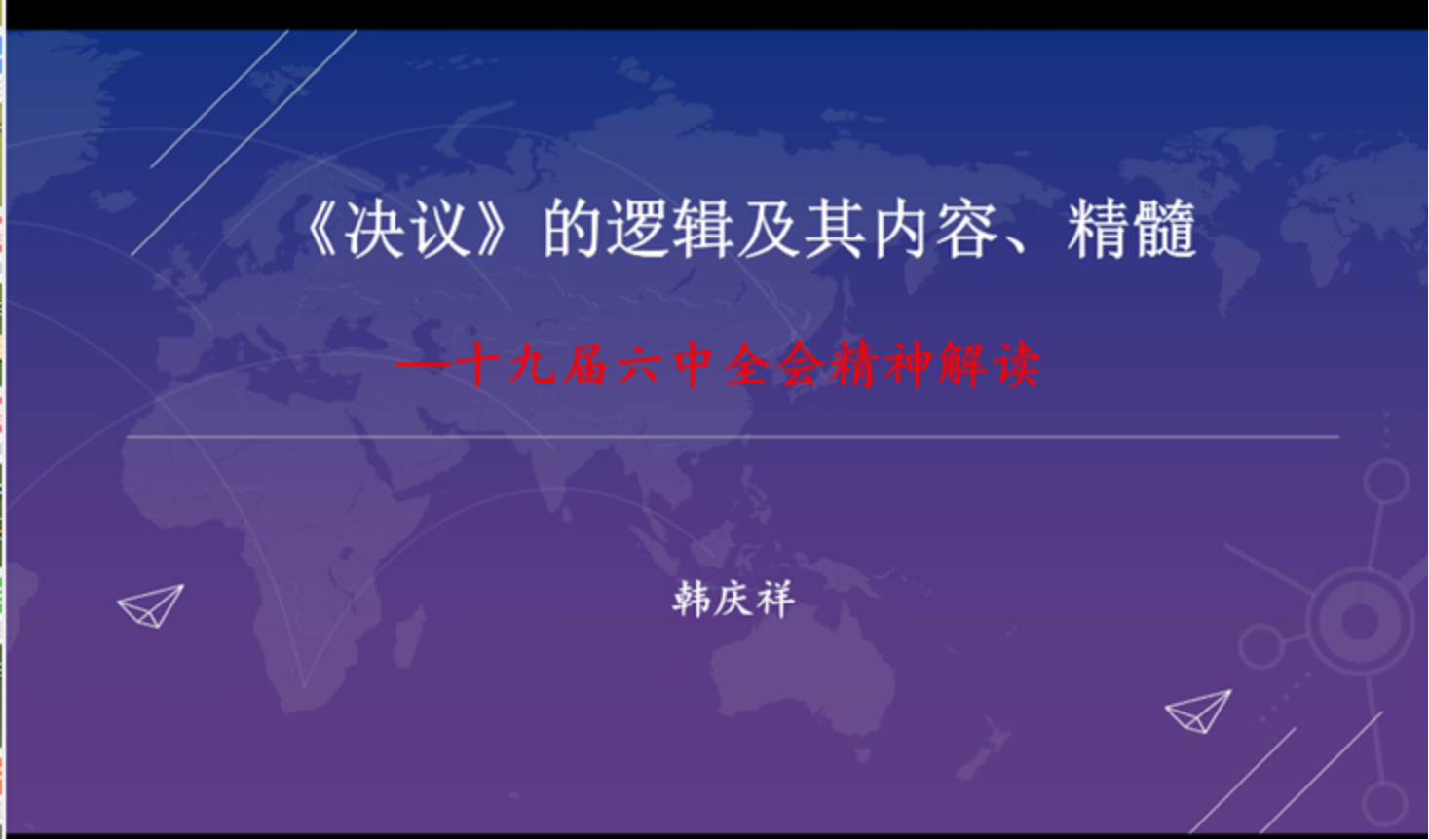2022年3月18日,在学校思想政治理论课教师座谈会召开三周年之际,金年汇金字招牌官网入口、金年汇金字招牌官网入口中共党史党建研究院、高校思想政治理论课“手拉手”集体备课中心(金年汇金字招牌官网入口——青海省)联合举办的“静如讲坛”2022年第一讲成功举行。中央党校一级教授,原中央党校校委委员、中央党校副教育长兼哲学部主任韩庆祥应邀作了题为“《决议》的逻辑、内容与精髓—十九届六中全会精神解读”的专题讲座。金年汇金字招牌官网入口师生、高校思想政治理论课“手拉手”集体备课中心(青海省)部分教师以及兄弟院校师生500多人聆听了讲座。讲座以线上腾讯视频会议形式进行,由金年汇金字招牌官网入口院长张润枝教授主持。 张润枝教授主持会议 张润枝院长对韩庆祥教授百忙之中做客静如讲坛表示衷心感谢,并向参与讲座的师生扼要介绍了韩教授的学术成就。韩庆祥教授围绕党的十九届六中全会精神和《中共中央关于党的百年奋斗重大成就和历史经验的决议》精神(以下简称《决议》),从六个方面概括了《决议》的逻辑及其精髓,即要用根本问题解释百年奋斗,用百年奋斗创造重大成就,从重大成就总结历史意义,从历史意义提升历史经验,以成就经验支撑两个确立,用“两个确立”确保强国复兴。 韩庆祥教授强调,《决议》具有深远重大意义,是统一全党思想、意志、行动,凝聚全党全军全国各族人民的智慧和力量。《决议》不仅为今年党的二十大胜利召开保驾护航,为未来近三十年党的政治格局与实现中华民族伟大复兴战略全局奠基坚实基础,而且更加坚定而自觉地为中国人民谋幸福,为中华民族谋复兴、为世界谋大同、为中国共产党谋强大、为马克思主义谋生机。 韩庆祥教授讲座进行 金年汇金字招牌官网入口副院长杨增岽教授在讲座最后作了总结。杨老师认为,韩庆祥教授两个小时的讲座从哲学视角系统阐释和分析了《决议》的内容、逻辑与精髓,使我们能够准确而深刻地领会百年党史决议的重大而深远的意义。韩老师所讲述的六个方面的内容各有各的内在逻辑,而从整体上看六个方面的内容又是一个完整整体,其中关于中国共产党特质、关于“五谋”的论述等,很多新见解、新解读和新阐释,值得我们认真思考。杨老师认为,韩教授的整场讲座逻辑清晰、内容丰富、思想深邃,注重历史、理论和现实的结合,为我们带来了关于党的十九届六中全会精神和百年党史决议的最系统、最前沿的解读。 杨增岽教授总结 “静如讲坛”是以已故中共党史学家张静如先生名字命名的学术讲坛,由金年汇金字招牌官网入口主办,旨在缅怀前辈学人的严谨治学风范和高尚学术人格。讲坛汇聚中共党史党建和学术界的一流专家学者,展示中共党史党建研究的最新前沿动态,为加强马克思主义理论教育和中共党史党建学科建设提供交流平台。