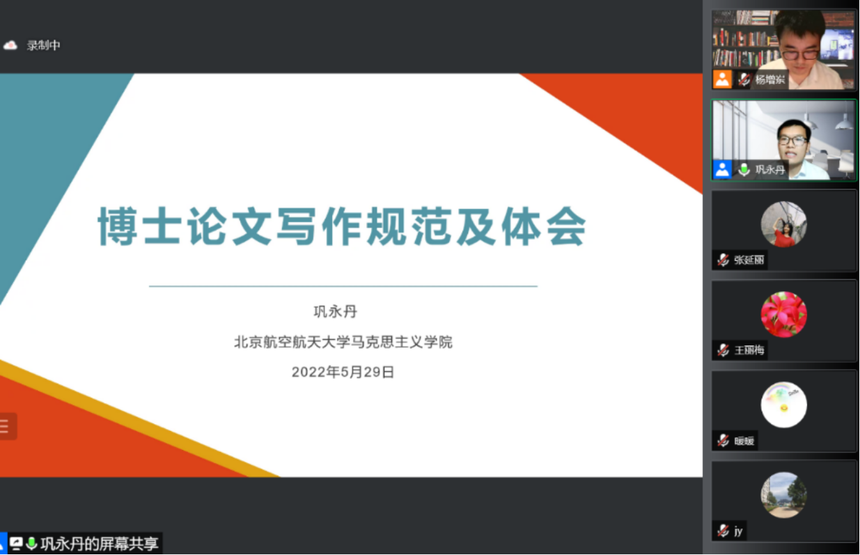 2022年5月29日,金年汇金字招牌官网入口线上举办“研究生学位论文指导系列讲座”第一讲。本次讲座聚焦博士学位论文写作,由金年官网博士毕业并分别获得“首届全国高校马克思主义理论学科优秀博士学位论文”、“金年汇金字招牌官网入口优秀博士学位论文”的北京工业大学金年汇金字招牌官网入口副教授陈艳飞、北京航空航天大学助理教授巩永丹两位老师做分享。讲座以腾讯视频线上方式进行,学院博士生、部分硕士生以及校内外其他同学约320人在线学习。学院副院长杨增岽教授主持了讲座。 陈艳飞副教授以“博士学位论文写作的三境”为主题,围绕博士论文写作历程,从论文选题确立、初稿撰写以及修改完善三个环节就如何撰写学术论文进行了精彩的讲授。陈老师认为博士论文选题要以“高”“尽”“独”为遵循,养成关注各类学术信息的良好习惯,并善于在研究中确定研究方向。同时在论文撰写过程中,要从核心概念界定、研究框架确立、写作资料搜集等方面下足功夫。最后,陈老师还为同学们介绍了PROCESS ON等实用的论文写作与分析工具。 巩永丹助理教授以“马克思主义理论学科博士论文写作规范”为主题,以马克思主义基本原理专业博士论文写作为例,提出“阅读经典是基本功,选好题目是硬道理,用好文献是要选择,守好规范是大前提,选对方向是关键点,最终通过是总目标”的论文写作要求。巩老师提出阅读经典的三层次即拓宽阅读的面,确定阅读的点,连接阅读的线,同时指出在选用文献的过程中对最新研究成果要做到批判性吸收。最后还从论文写作规范、送审、提交等方面提出了需要注意的问题。 两位分享嘉宾还认真选答了参会同学的的提问。整个讲座受到广泛好评。 讲座最后,杨增岽老师对两位老师的分享交流表示衷心感谢,从四个方面总结概括了分享嘉宾在写作博士论文过程中的共性优点;结合近年来博士学位论文评阅与论文抽查的情况做了介绍,认为不同的目标要求和自觉意识决定了对待学位论文的不同态度;指出博士学位论文写作从打心底里喜欢做学术研究进而确立一个好的选题作为开始,是博士生的学养、学识、学风与研究能力的集中反映,选题过程是学术旨趣、选题价值、个人能力、导师关注等多重因素有机结合从而做出最佳决定的过程。杨老师同时指出,研究方法、研究思路与研究结论要经得起逻辑推敲,要在循序渐进上下功夫,任何“一招鲜”或“绣花拳”都是难以为继的;勉励大家进一步增强学位论文的重视度,尽早进入写作最佳状态。杨老师表示,学院将进一步为博士生写好学位论文提供积极指导,后续还将陆续采取多种形式深入开展专题论文写作指导。